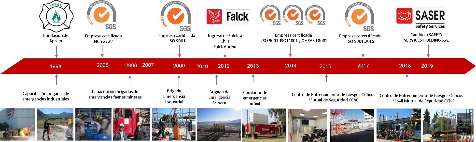 SASER Holding es la continuadora de una trayectoria de más de 20 años iniciada por APREM, fundada el año 1998, y que en Abril de 2012 pasa a formar parte de FALCK Group – Dinamarca, adoptando el nombre de FALCK Chile y donde permaneció hasta Marzo de 2019, dando paso a partir de esa fecha a SASER Holding, Compañía nacional que mantiene la estructura directiva, administrativa y técnica de los últimos 7 años, brindando continuidad operativa en los servicios entregados a los Clientes.